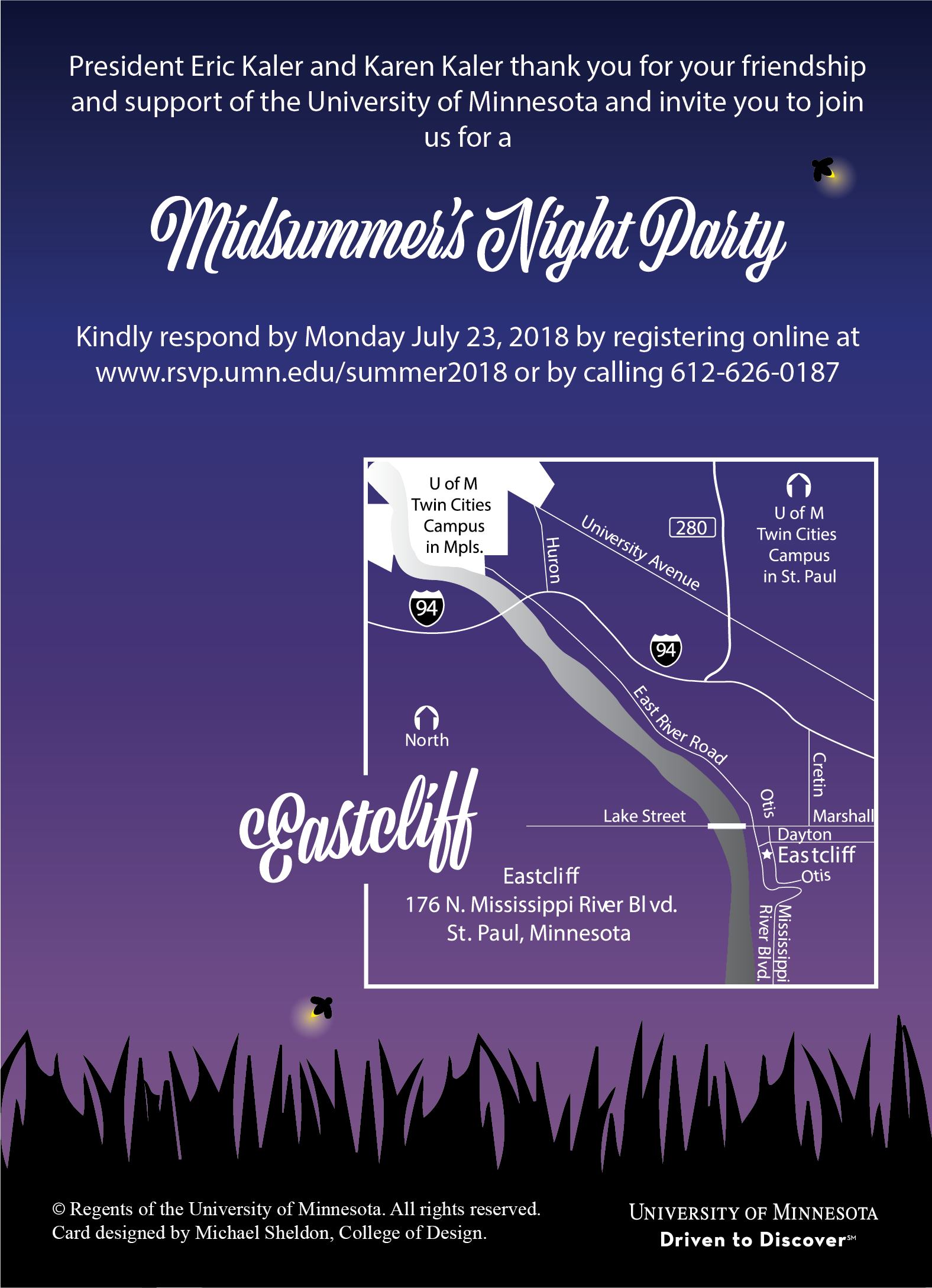 In the course, Text & Image, an assignment was to create a party invitation for President Kaler's annual summer party. The theme for the Kaler's 2018 summer party was, Midsummer's Night Party. Of all the invitations, the Kaler's used mine as their 2018 invitation.